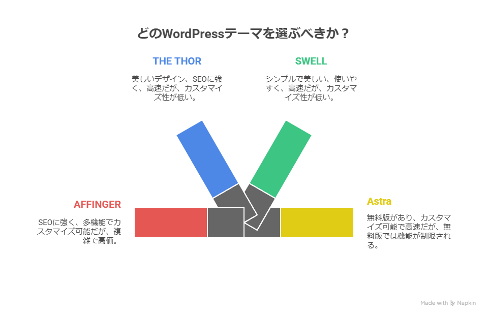 ここでは人気の有料テーマAFFINGER、THE THOR、SWELL、Astraについて、それぞれの特徴や実際の使い勝手を比較しながら紹介していきます。